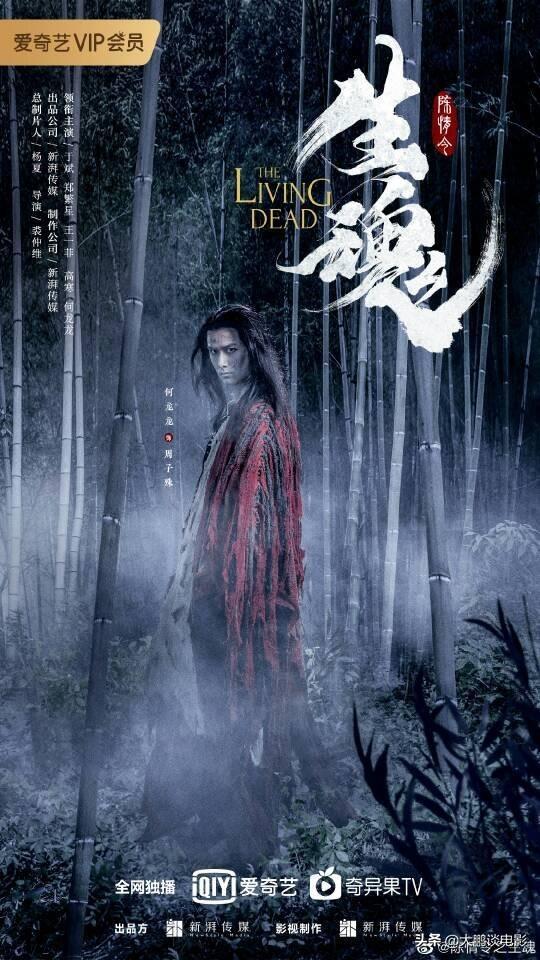 最后一位是何龙龙扮演的周子殊,海报中的他简直就是鬼将军第二,头发散乱,身上红、黑、白三色布条,一副破破烂烂的造型,简直像是从哪座墓中刚挖出来一般。