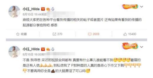 在这简短的回应中不难看出小钰本人是因为这个时间受到了很大伤害,而因为这张图片被大肆传播造成的影响还在扩大,小钰在微博之后也是呼吁粉丝和网友不要进行传播,并希望网友帮助找出事件源头以维护自己的权益。事件源头暂时不得而知,但是在短短的几小时时间里能够迅速传播扩散,显然不是一起单纯的事件。