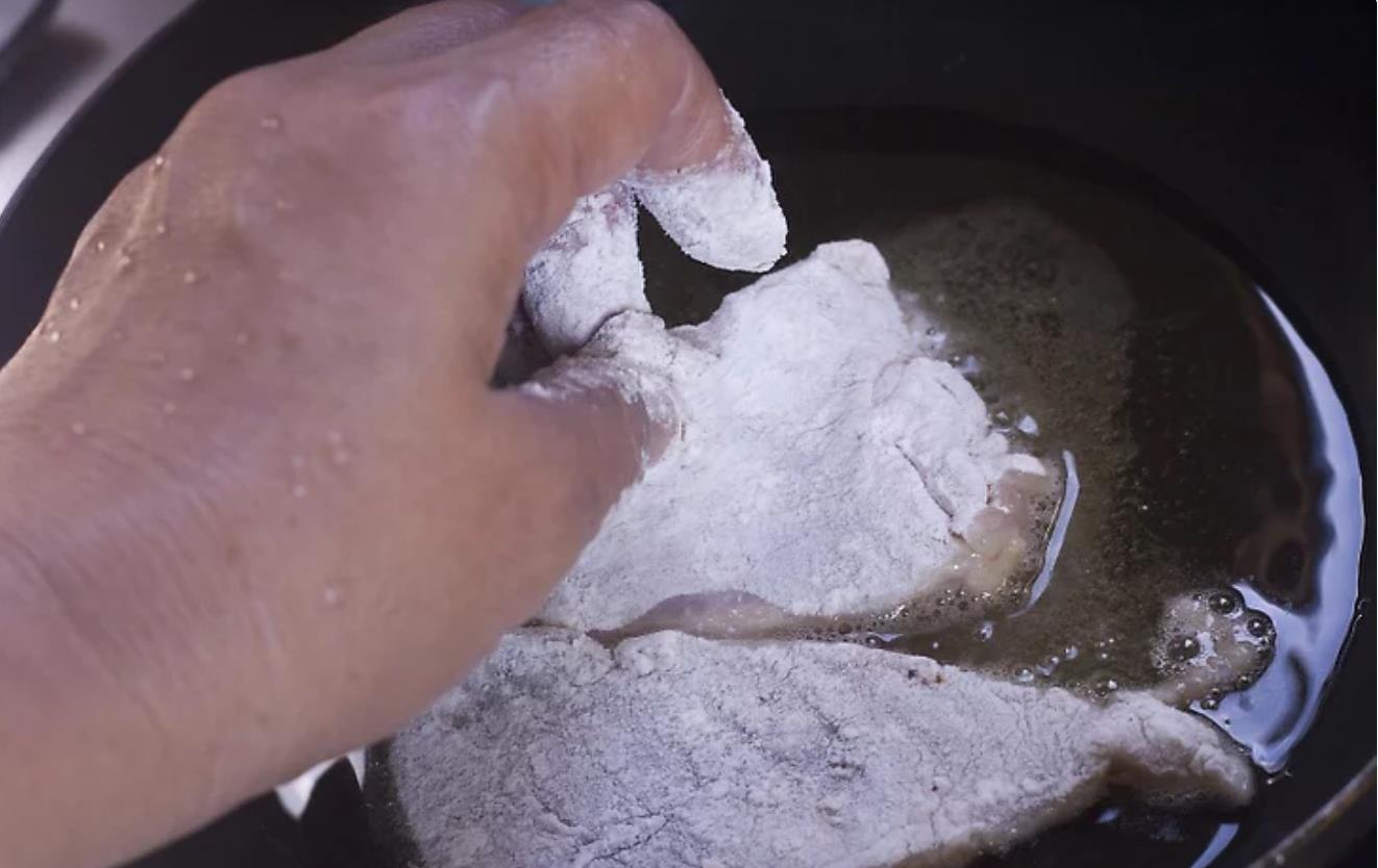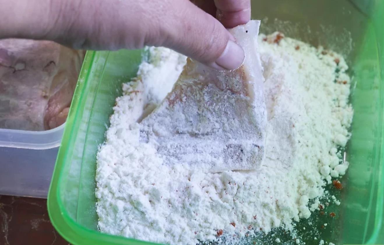4.鱼排上浆。确保鱼排完整蘸上拌粉,可以将鱼排和拌粉放在纸袋里,轻柔摇晃,使鱼排均匀蘸满拌粉。