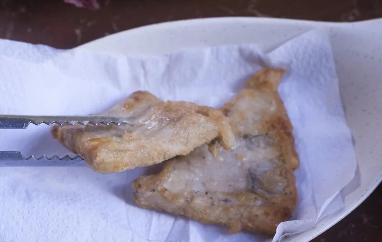 6.移出鱼排,沥干多余油分。用漏勺捞出鱼排,放在铺有吸油纸的餐碟上。柠檬角和塔塔酱和炸鱼排搭配最佳。