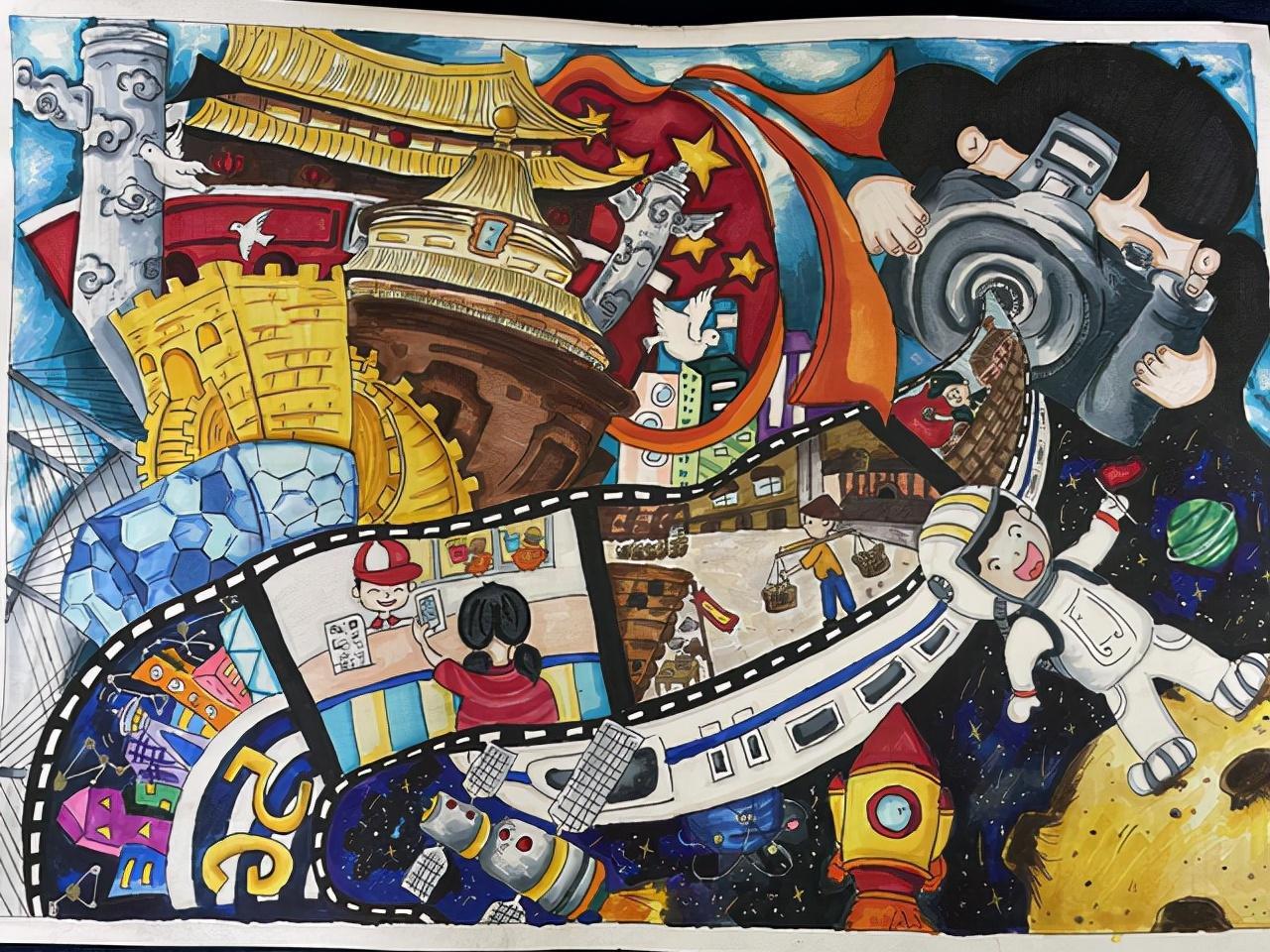 这件作品虽然工具材料不很复杂,但构思比较巧妙,作者运用了照相机镜头,比较生动地表现了祖国高度发展、经济繁荣背景下的一系列重要变化。弯曲的仿若胶片般的构图,给人以流动的画面感,各种中国传统文化与现代科技、文化成就的代表性内容交相辉映,显得充满变化又不凌乱。这种元素的变形处理,与画面的整体风格相对应,烘托出了画面气氛。较深的背景色调,也把前景的物体衬托得更加醒目。