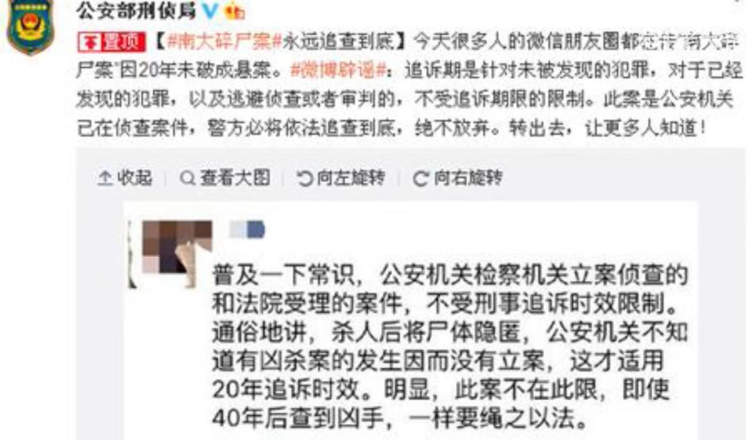 2016年公安部刑侦局表示,南大碎尸案不受20年追诉期限制,警方必将追查到底,决不放弃!
