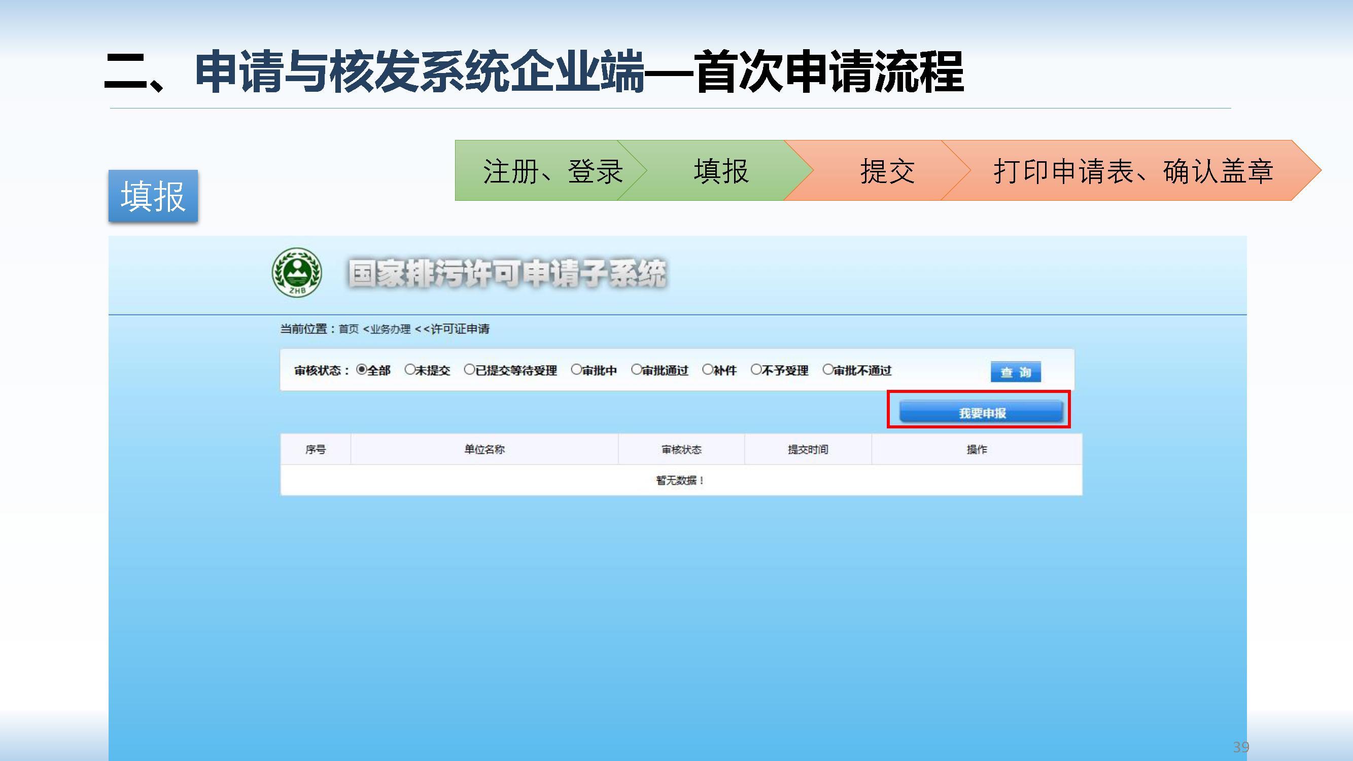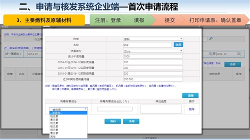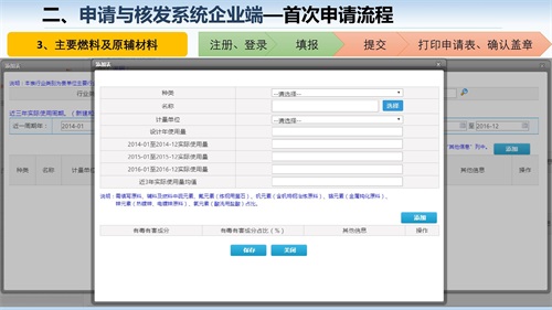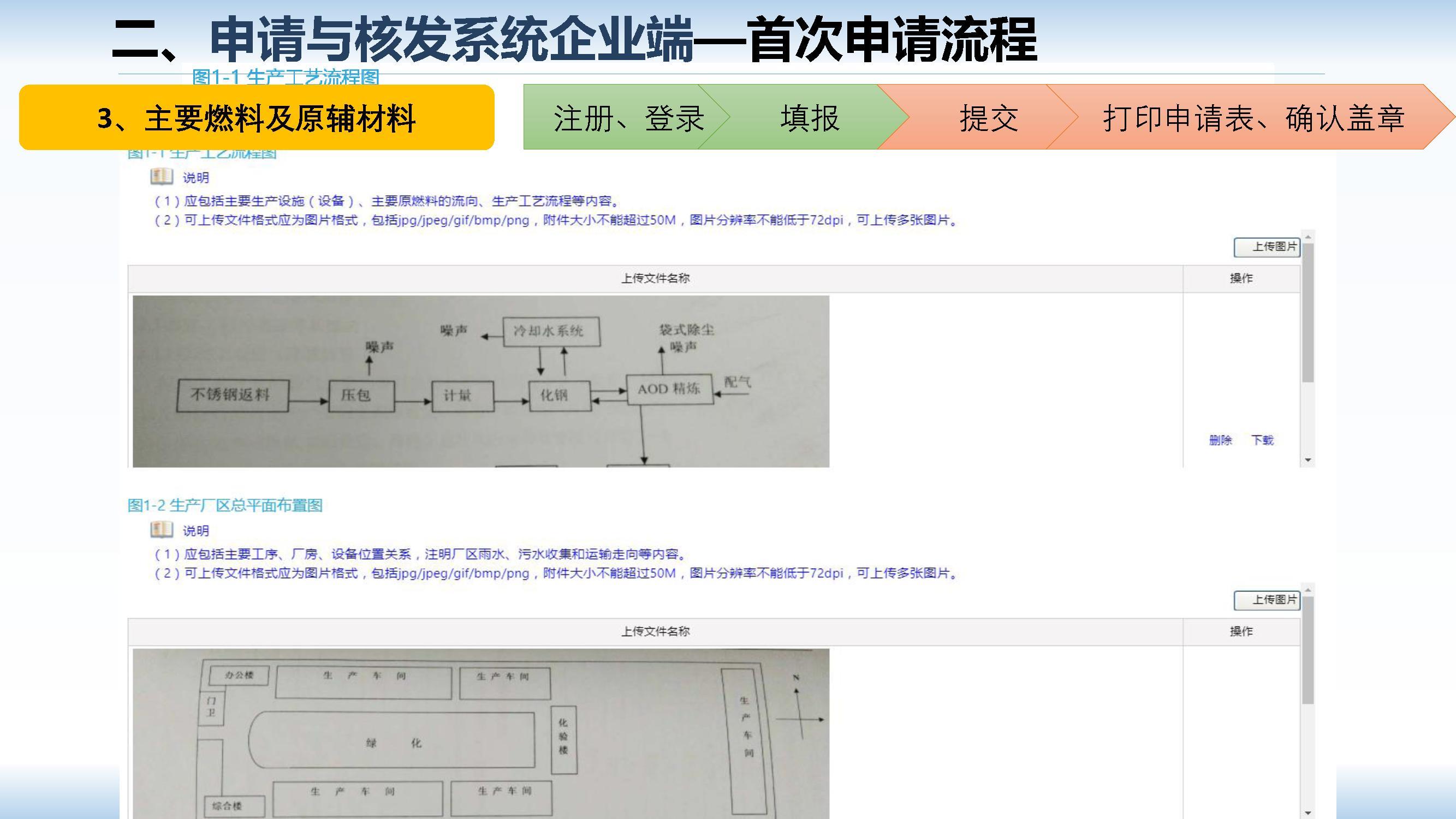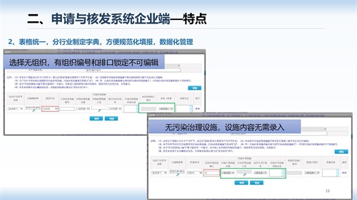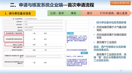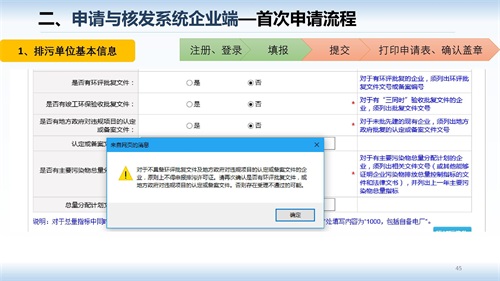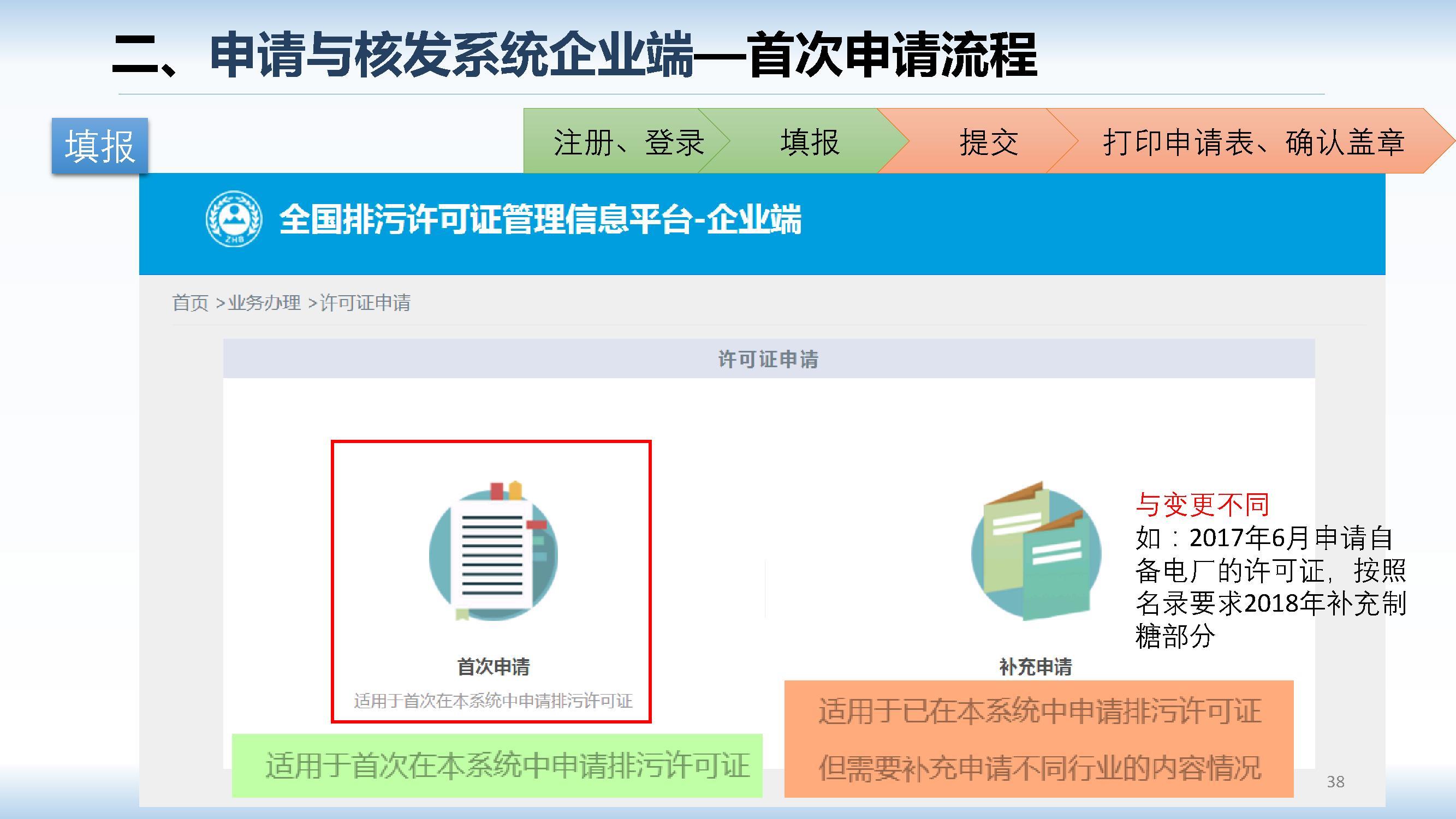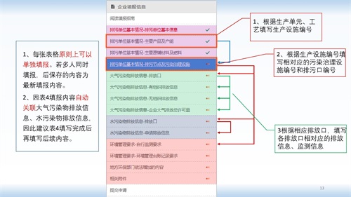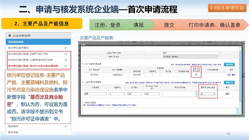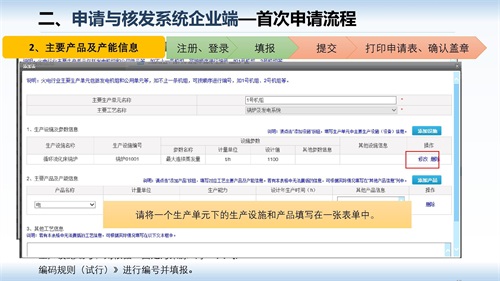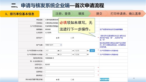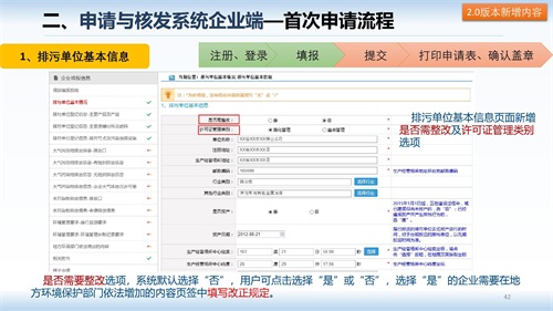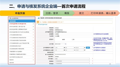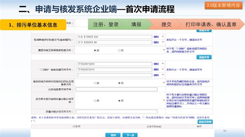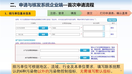 其次,介绍了企业端的一些特点。包括企业端的基本操作、申请流程等。考虑到企业大多数均是首次在全国排污许可证管理系统中申请,所以多数申请为首次申请。 填报包括排污单位基本情况、主要产品及产能、排污节点集污染治理设施、排放口等等十几项子填报项目。