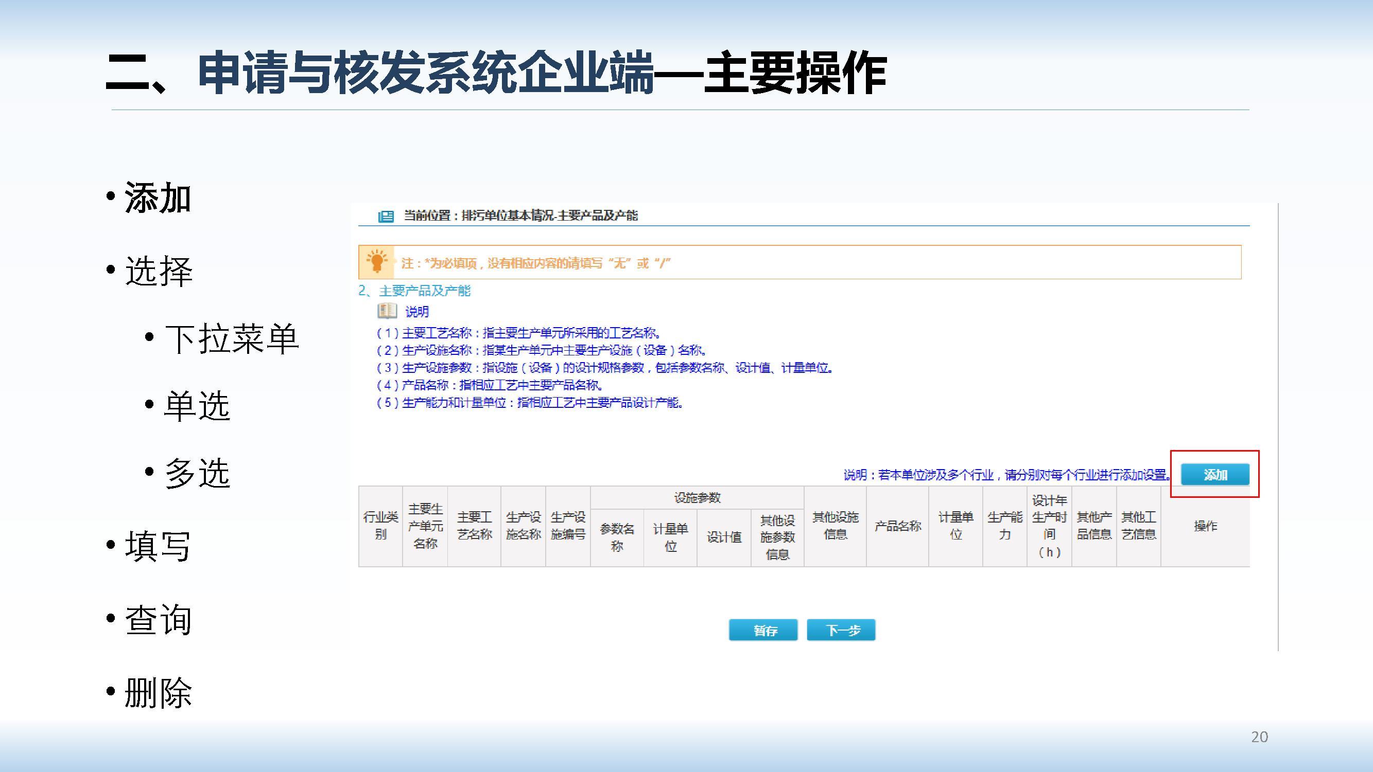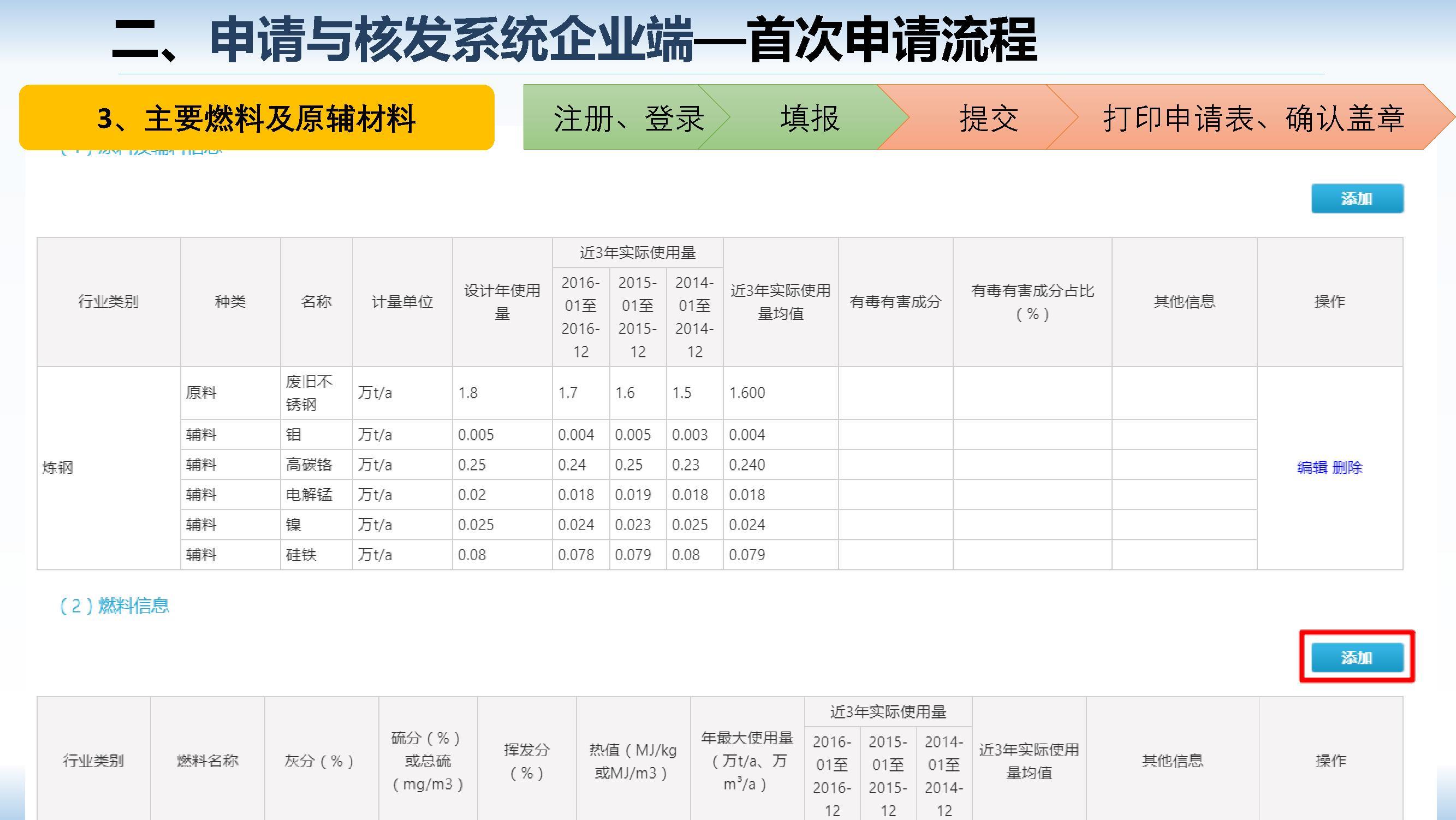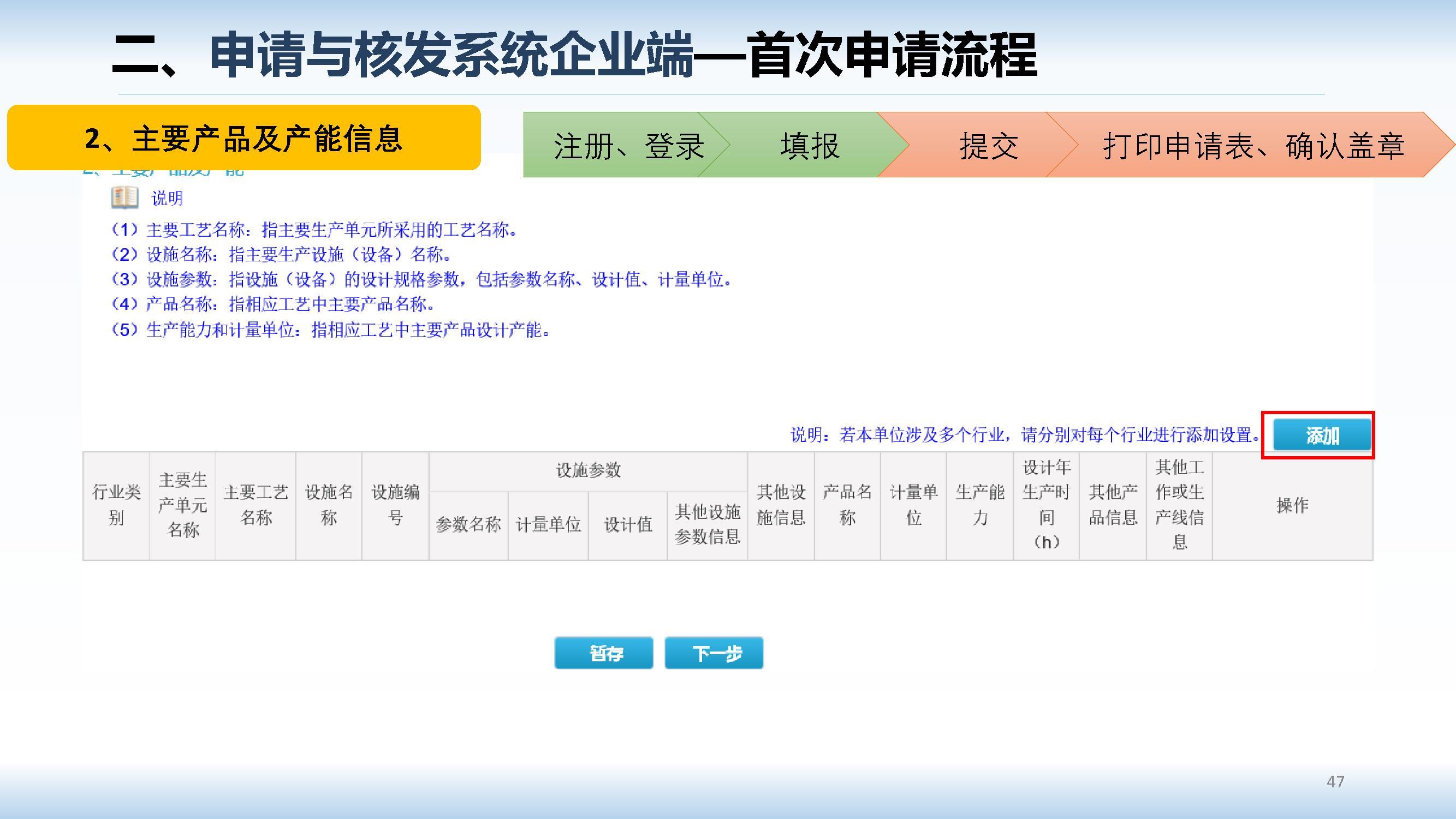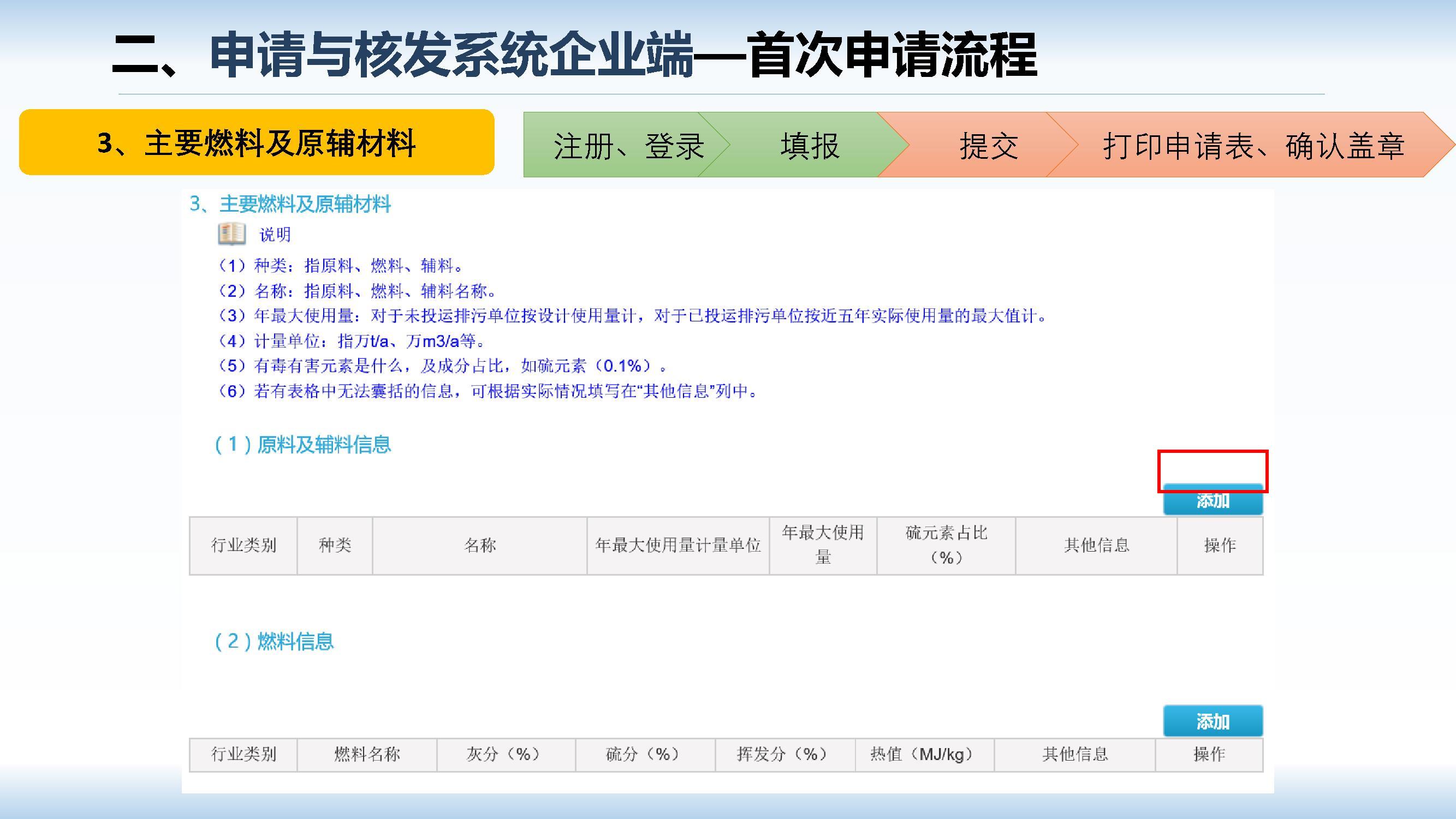 其次,介绍了企业端的一些特点。包括企业端的基本操作、申请流程等。考虑到企业大多数均是首次在全国排污许可证管理系统中申请,所以多数申请为首次申请。 填报包括排污单位基本情况、主要产品及产能、排污节点集污染治理设施、排放口等等十几项子填报项目。