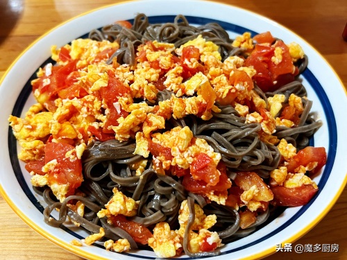 另起一锅烧开水,煮面条,我用的是黑荞麦挂面。煮熟以后捞出装盘,再浇上番茄炒鸡蛋即可。