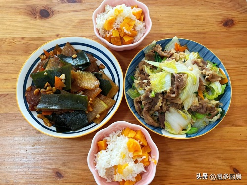 午餐是这样的:因为中午只有我和两个孩子,两道菜就足够了。一道娃娃菜炒牛肉,一道是冬瓜烧海带,主食则是红薯米饭。