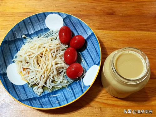 我自己的晚饭就更简单了,毕竟我要控制体重嘛。一杯豆浆,少许水煮金针菇,还有几个小番茄,这就是我的晚饭了。