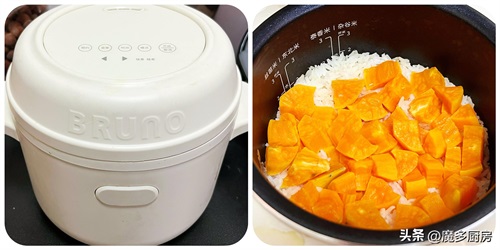 中午的主食是红薯米饭,也是我家常做的米饭之一。大米洗净放到电饭锅里,红薯去皮切小块,放到米上,加适量清水,电饭锅焖煮功能,饭好之后非常香。