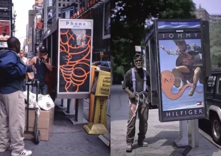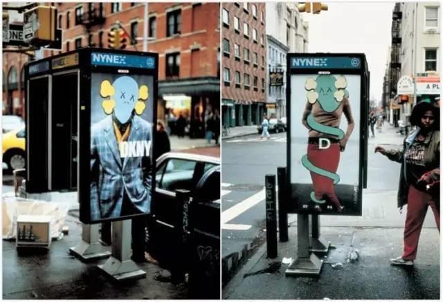 KAWS在街头看到有好看广告画,就取下来带回工作室进行涂鸦,之后再将创作好的海报回归原位。这些富有艺术感又与商业广告相融合的海报使他收获了“涂鸦怪盗”的美誉。