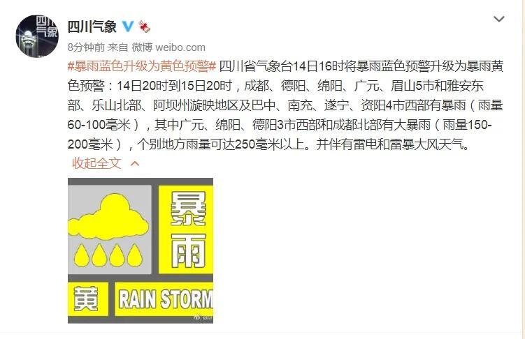 四川省气象台14日16时将暴雨蓝色预警升级为暴雨黄色预警:14日20时到15日20时,成都、德阳、绵阳、广元、眉山5市和雅安东部、乐山北部、阿坝州漩映地区及巴中、南充、遂宁、资阳4市西部有暴雨(雨量60-100毫米),其中广元、绵阳、德阳3市西部和成都北部有大暴雨(雨量150-200毫米),个别地方雨量可达250毫米以上。并伴有雷电和雷暴大风天气。