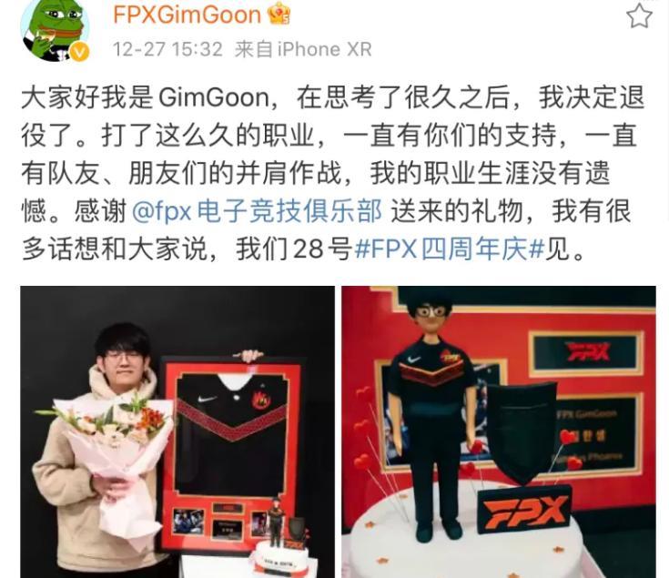 鉴于大家都很关心此事,刚刚金贡本人也是在微博中发文回应了此事,金贡表示“思考了很久决定退役了,打了这么久的职业,一直有大家的支持,有队友、朋友们并肩作战,职业生涯已经没有遗憾了,还有很多话想跟大家说,我们FPX四周年见。”