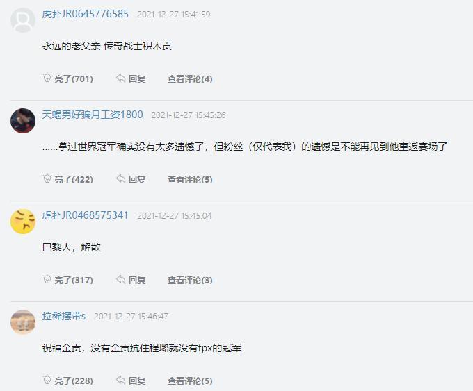 还有网友表示"贡子哥我从gt看到fpx,曾经顶尖的进攻型上单越来越老,原本以为到fpx是养老,自己慢慢的转变为最稳的一环,到世界赛的无数rank,不想拖团队后腿,四强成功的挡住了ts,吃草挤奶,成就了fpx的s9。"
