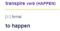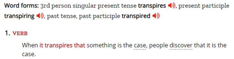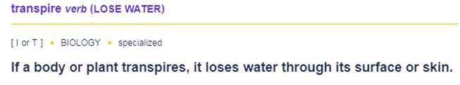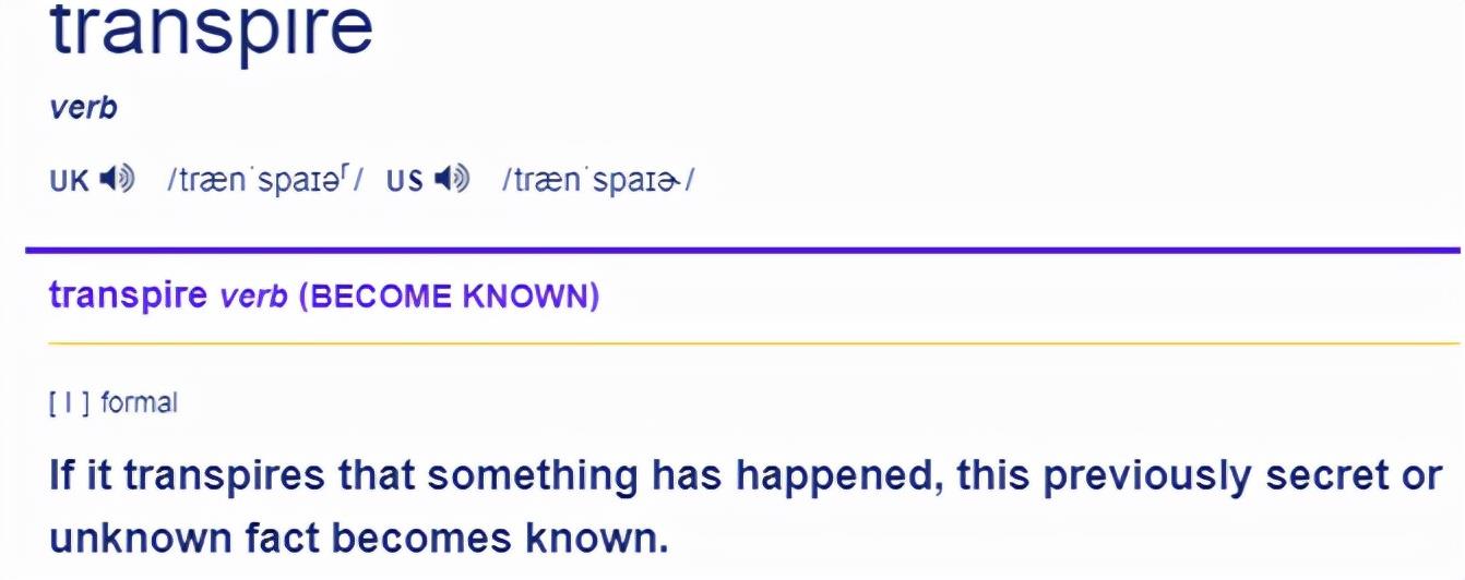 transpire (trænˈspaɪə) v. 发现,发生,蒸发