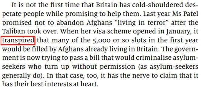 It is not the first time that Britain has cold-shouldered desperate people while promising to help them. Last year Ms Patel promised not to abandon Afghans “living in terror” after the Taliban took over. When her visa scheme opened in January, it transpired that many of the 5,000 or so slots in the first year would be filled by Afghans already living in Britain. The government is now trying to pass a bill that would criminalise asylum-seekers who turn up without permission (as asylum-seekers generally do). In that case, too, it has the nerve to claim that it has their best interests at heart.