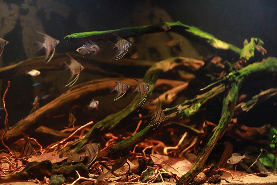 在为尖管吻鲶布置鱼缸时,我会提供大量的沉木和石头,创造栖息地和藏身之处,基质我会选择深颜色的材质,毕竟它们一动不动的时候比较难看见。