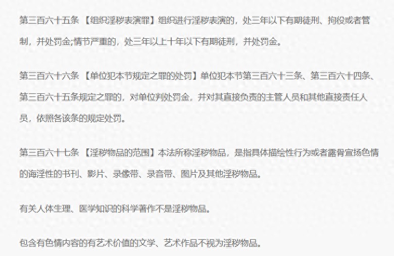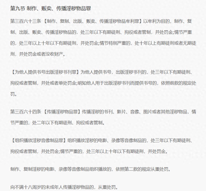 而此次脸肿汉化组组长所涉及的罪名主要应该是《刑法》第九节“制作、贩卖、传播淫秽物品罪”,法条如下: