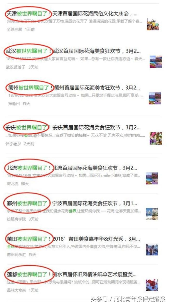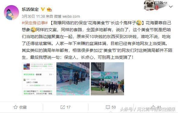除此之外,所谓的“美食节”来到保定并大张旗鼓宣传,使用十分有诱惑力的文案及图片,让“美食节”一下子变得“高大上”起来,相关部门除了处罚主办方外,是否也应有人对发布类似不负责任消息的宣传渠道进行惩罚呢?不要让“花海”和“美食”透支老百姓的信任。