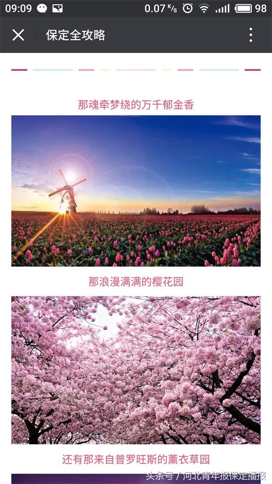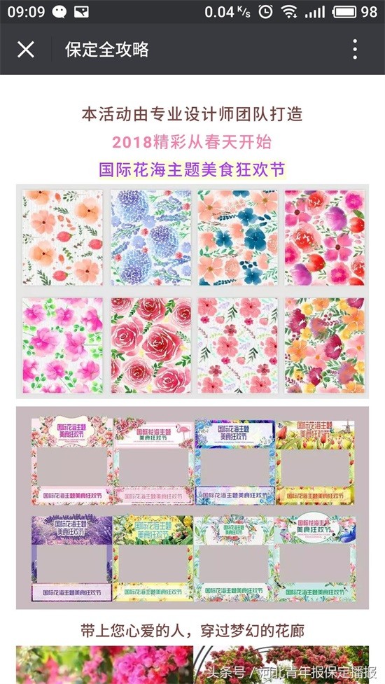 3月25日,保定一微信公众号“保定全攻略”发布标题为《保定被世界瞩目了!保定首届国际花海美食狂欢节,3月30日开幕!领福利》的文章,其中提到,3月30日开始,“国际花海主题美食狂欢节”将在保定源盛广场开幕。该消息中还提到,保定人可免费获赠“不限量逛吃券”。文章中还使用了郁金香、樱花等多幅鲜花配图及世界各地美食图片。吸引了众多网友关注,也引发了众多网友转发。