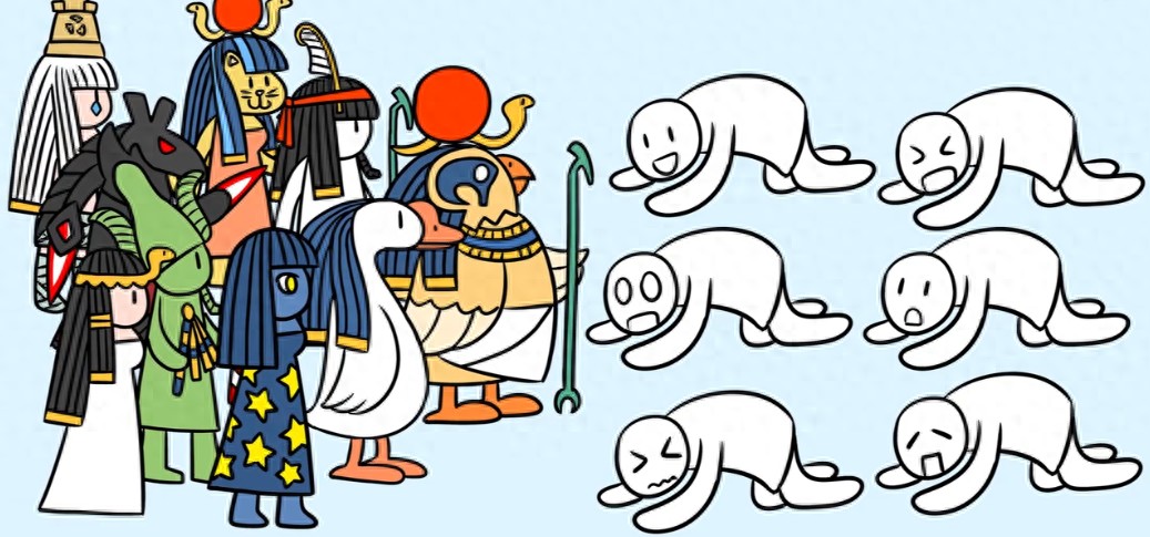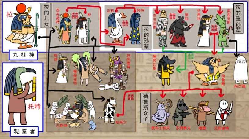 由于古埃及文明最初是由很多部落通过战争逐渐形成的国家,最厉害的大酋长后来就成了至高王,也就是法老。所以埃及的众神很多在被吸收进统一的谱系之前,本是各个地区的部落守护神。但是在后来形成的神话体系中光有主神也不行呀,虽然那些小部落打不赢就得服软,但是为了民族团结和谐发展,总不能把那些小部落的神给直接废了吧?所以古埃及就形成了一种以九柱神为核心的神话谱系。其他诸神就变成了九柱神的兄弟姐妹及后代,正所谓打不赢就装孙子。