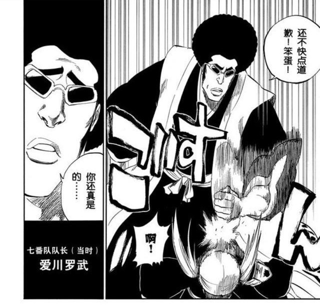 六、爱川罗武。尸魂界护廷十三番队原七番队队长,经常在楼十郎发表自己的美学理论时吐嘈对方。空座町大战结束后,选择和其他假面军势成员留在现世,在代理死神消失篇运用自己的灵压,协助浦原喜助制成协助一护恢复死神力量的灵刀。在千年血战篇协助日世里执行修复现世和尸魂界之间的扭曲现象的工作,后来配合日世里一起与奇迹杰拉德·瓦尔基里战斗,却被击退(好弱的一位队长-_-||)。斩魄刀:天狗丸。解放语:打碎它,天狗丸,解放后宛如特大号仙人掌的狼牙棒,具有强大的蛮力和爆发力,利用其重量加上离心力进行攻击。卍解能力未知……