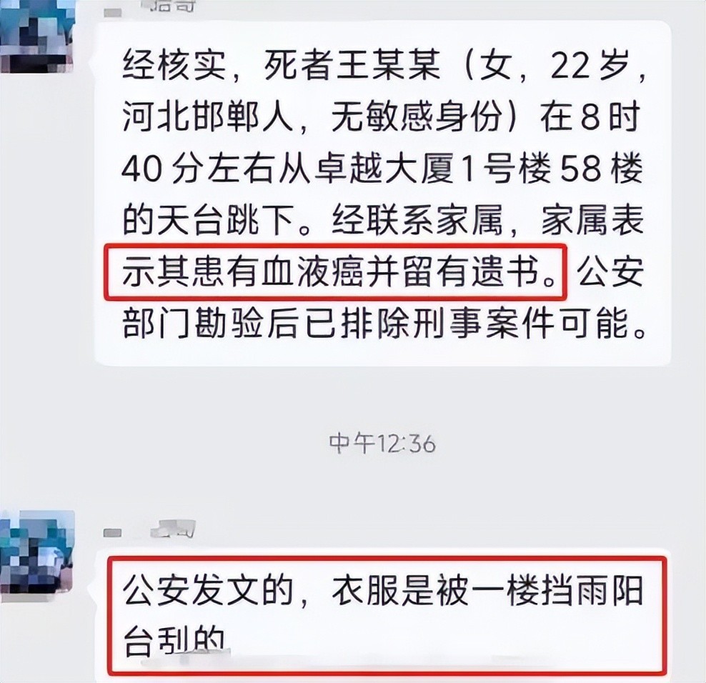 女子名叫王某某,今年22岁,是河北邯郸人。女子在跳楼之前给家属留下了遗书,遗书中称自己患了血液癌,也就是我们常说的白血病,因此才跳楼轻生。目前警方已经排除了刑事案件的可能。