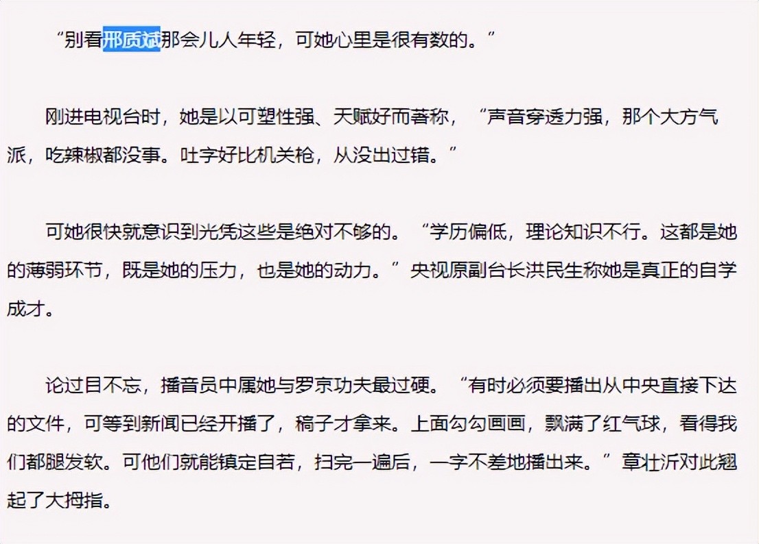 邢质斌和罗京却从未出过错,他们扫完一遍后,就能一字不差地播报,这让央视原新闻中心主任章壮沂赞赏有加:“论过目不忘,播音员中属邢质斌与罗京功夫最硬,那些稿子上面飘满了红气球,看得我们腿都发软,可他们就能镇静自若地播出来。”
