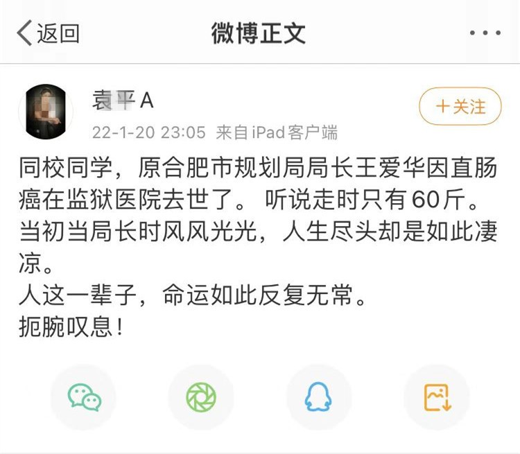 同校同学,原合肥市规划局局长王爱华因直肠癌在监狱医院去世了。 听说走时只有60斤。当初当局长时风风光光,人生尽头却是如此凄凉。人这一辈子,命运如此反复无常。扼腕叹息!