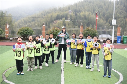 赵丽娜和山区小球员们一起举起“星球计划”应援牌。图/九派新闻 邵骁歆