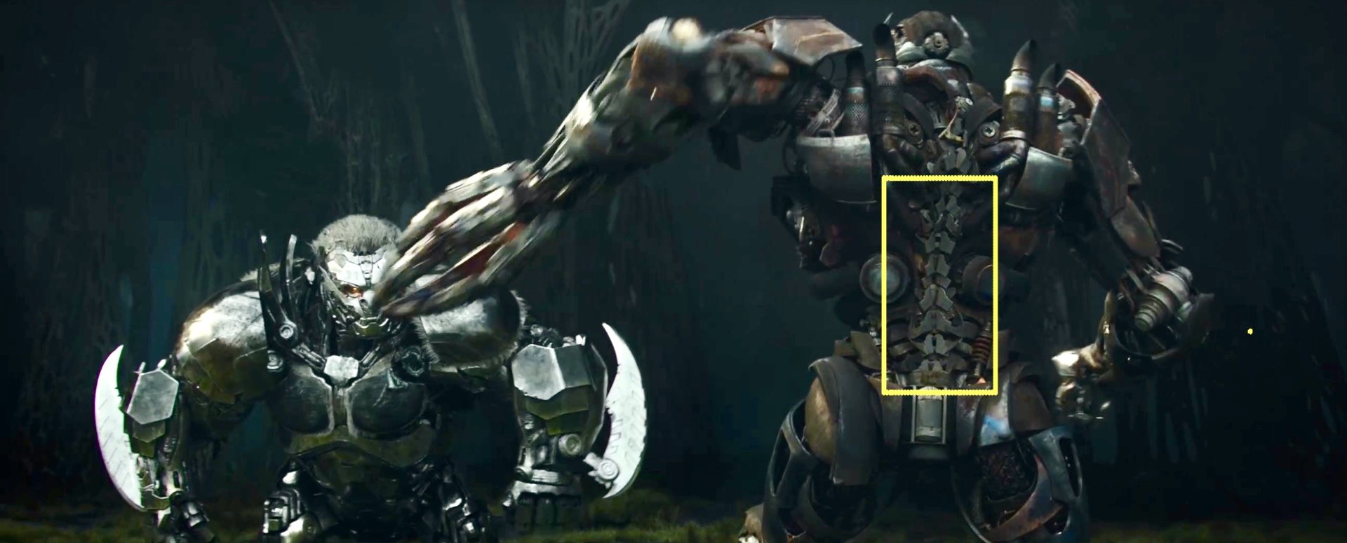 他的背上能够看到一条清晰的金属脊柱,这和《变形金刚4》禁闭是一模一样的。