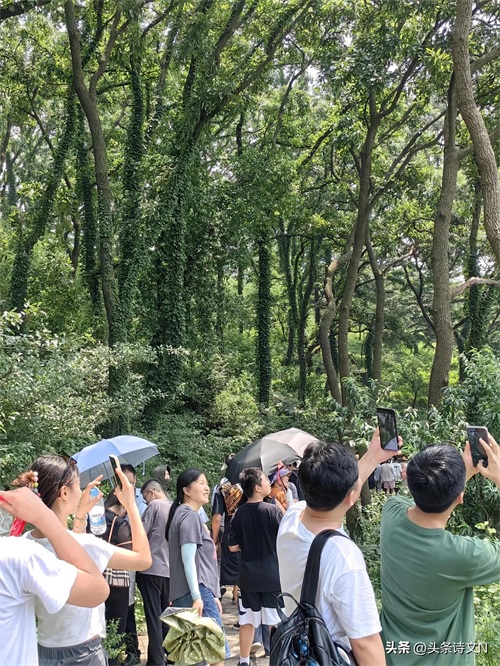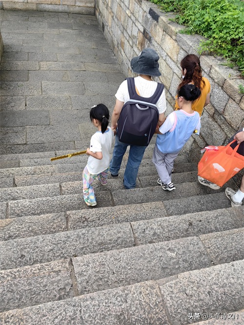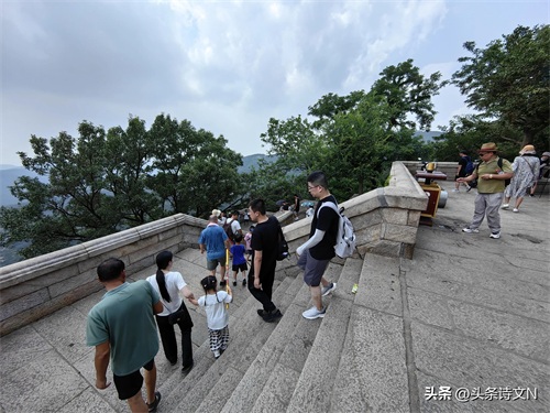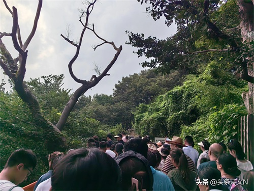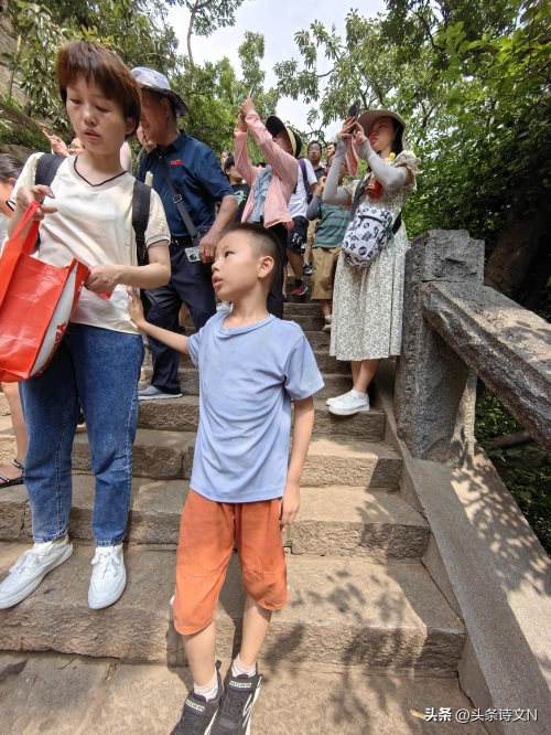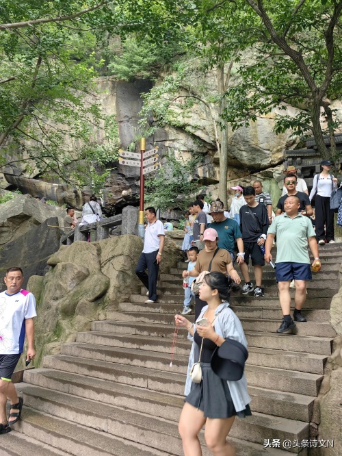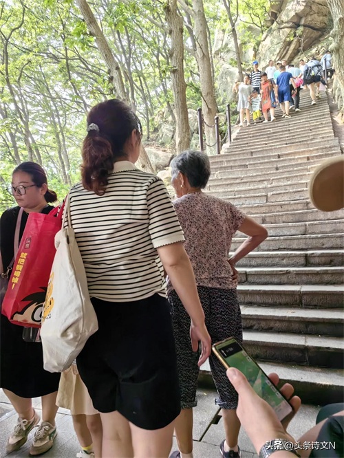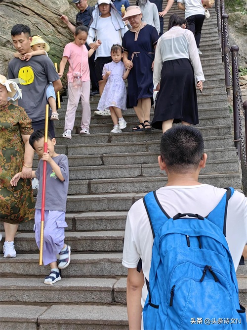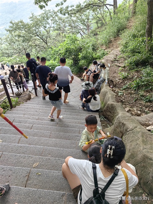 人们越来越静默了,闷着头继续赶往水帘洞的方向。山高路陡,全是台阶。前面的一个小男孩喊着,不行了,我不行了。另一个说我也不行了。后面一个小女孩哭着坐在地上,就是不站起来。妈妈和姥姥哄着劝着说,我们也背不动你了,休息一会儿吧,别哭了。只要有休息的地方都坐满了人。卖观光车票的工作人员说,水帘洞离此地不远,谁知道越走越远,总是走不到啊。中途遇到一个带队的导游,用喇叭在寻找走丢的孩子。游客们奇怪了,怎么在山里见不到一个工作人员?也见不到志愿者。公共厕所很少,离的很远,也很少有标志牌和清洁员。路上和休息的人群中,开始有人发牢骚,提意见。也罢,就跟着人流走吧。金箍棒已经变成了人们的拐杖了。
