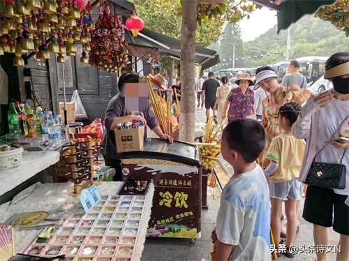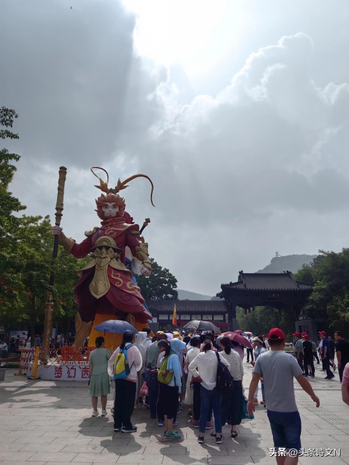 山门前面都是售卖点儿。游客中亲子游的家庭非常多。家长们给小朋友买了金箍棒,铁扇公主的扇子,唐僧师徒的脸谱等等玩具。欢声笑语亲情满满,吃点冷饮,拍些照片。这就是亲子游的魅力所在,恐怕也是人流如潮的原因吧。