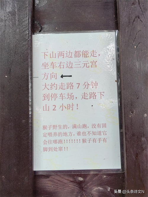 罕见的看到了,园中的通知。弄不清心里是啥滋味儿。又走了一会儿,终于到了下山的乘车点。真是羡慕当地的朋友有福气呀,住在四大灵山花果山的周围。真的盼望景区改进服务啊。当地和今后来的游客,曙光亭上观赏日出云海;玉女峰前欣赏绝美日落。 朋友们,你们不妨来花果山体验一番吧。年轻人可以多玩几次,别忘了这里可有136处美丽风景啊。