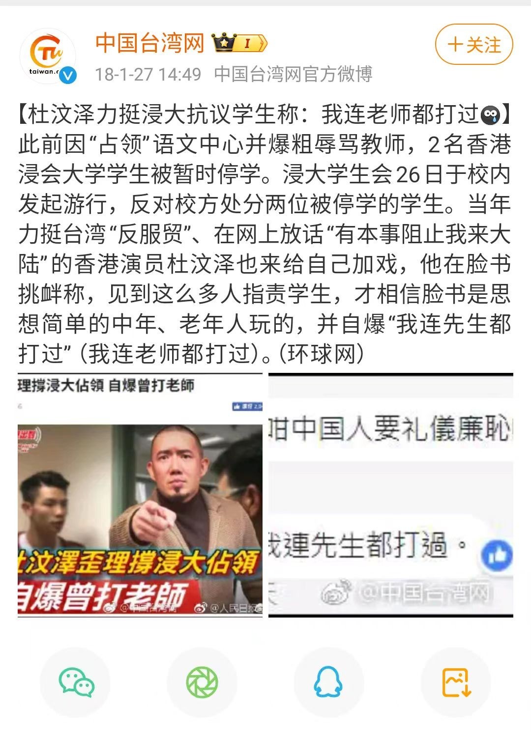 对于这一行为必然是不正确的,但杜汶泽却跳出来,不去利用自己的明星知名度去劝阻,反而煽风点火的进行支持,并且还说他们的做法不算什么,自己以前还打过老师。