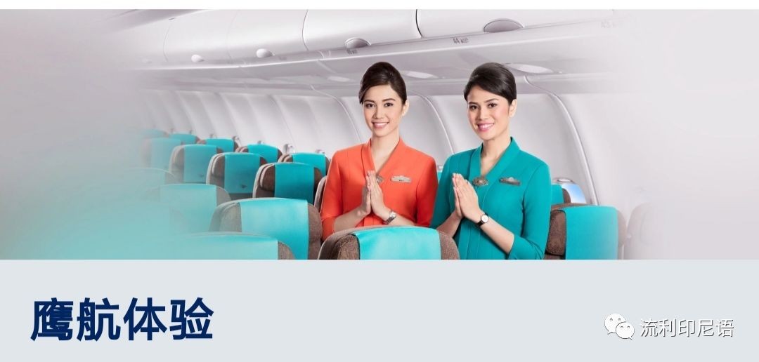鹰航作为印尼国有航空公司,身兼一项重要使命就是把印尼推向世界。您可以看到机舱内部装潢都带有印尼特色文化,乘坐鹰航您能闻到印尼鲜花的沁人芳香,听到悦耳的印尼本土民歌,尝到原汁原味的印尼传统美食和特色饮料,为乘客带来最佳的印尼饮食、文化和风土人情的体验。