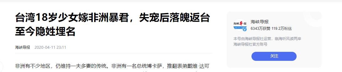 海峡导报2020-04-11 23:11报道:台湾18岁少女嫁非洲暴君,失宠后落魄返台至今隐姓埋名