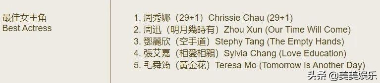 之后,《29+1》把她捧上了高登电影奖(华语电影)最佳女主角的宝座,要知道,当年的竞争对手可是惠英红、张艾嘉,