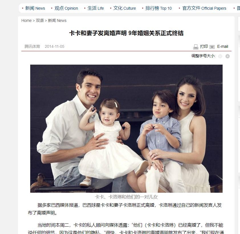 腾讯体育 2014-11-05,标题:卡卡和妻子发离婚声明 9年婚姻关系正式终结