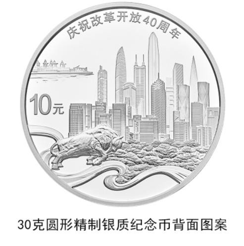 30克圆形银质纪念币背面图案之二为深圳城市建筑、蛇口港、拓荒牛雕塑及飘带等组合设计,并刊“庆祝改革开放40周年”字样及面额。