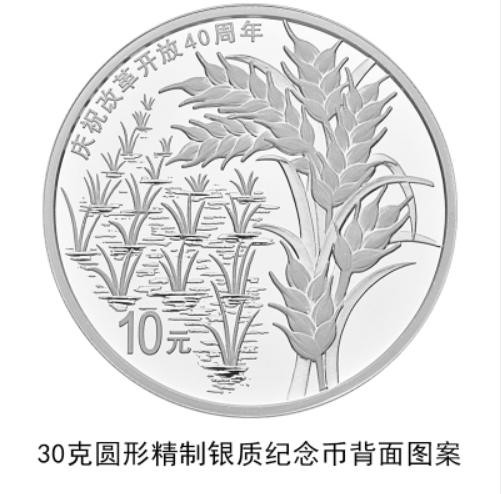 30克圆形银质纪念币背面图案之一为象征农村改革启始(安徽小岗村)的禾苗和稻穗,并刊“庆祝改革开放40周年”字样及面额。