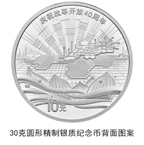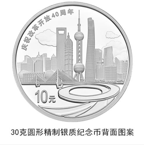 30克圆形银质纪念币背面图案之三为上海浦东标志性建筑及南浦大桥、黄浦江等组合设计,并刊“庆祝改革开放40周年”字样及面额。
