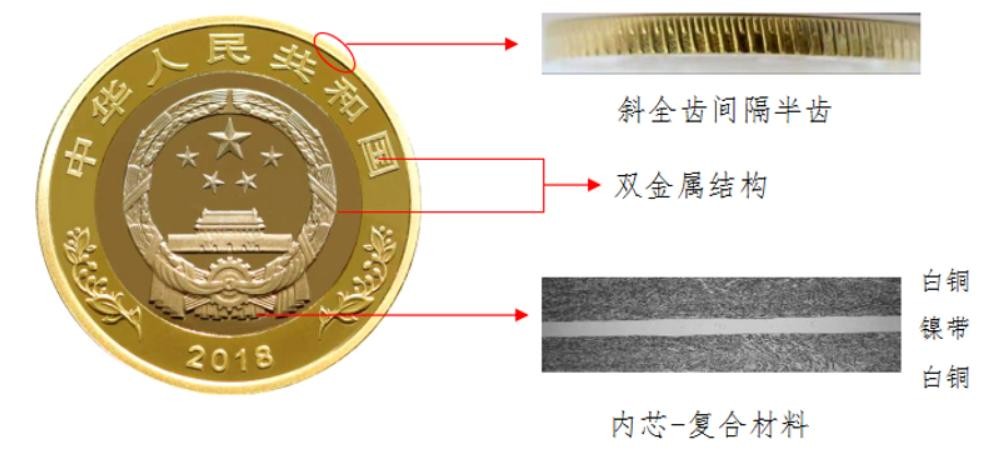 硬币外环为黄色铜合金,内芯为具有独特机读性能的镍带复合白铜材料。
