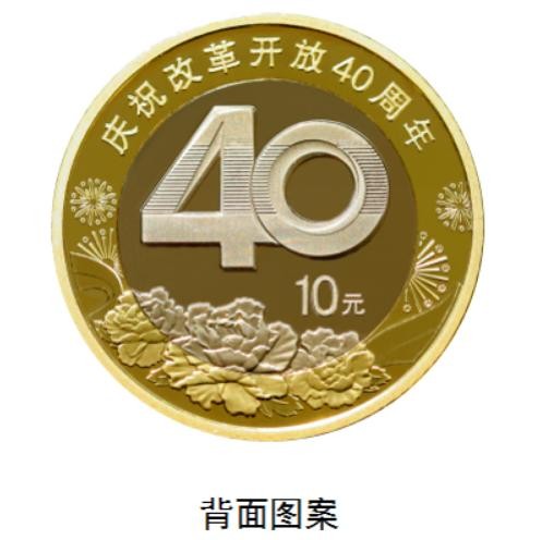 双色铜合金纪念币背面主景图案为阿拉伯数字“40”,背景图案为牡丹花、飘带和礼花。主景图案上方刊“庆祝改革开放40周年”字样,右下方刊面额“10元”字样。