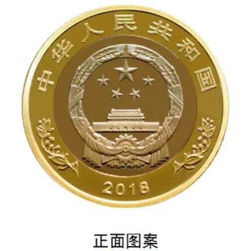 双色铜合金纪念币正面图案为国徽,国徽上方刊“中华人民共和国”国名,下方刊年号“2018”字样,左右两侧为果实图案。