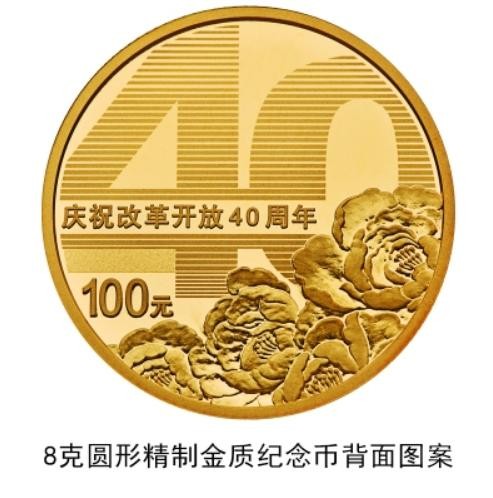 8克圆形金质纪念币背面图案为数字“40”造型与牡丹花组合设计,并刊“庆祝改革开放40周年”字样及面额。