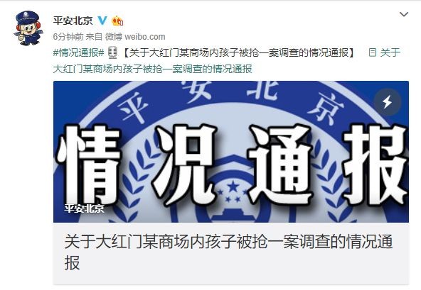 通报介绍,10月2日,丰台区大红门某商场孩子被抢一案引发社会高度关注,市公安局组织专班对案件进行了复核。