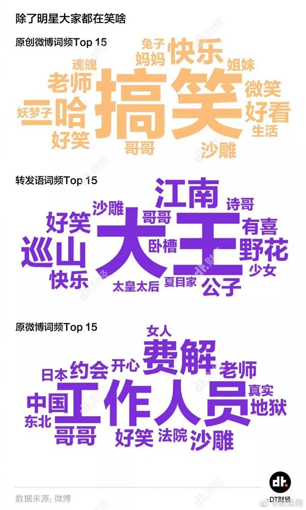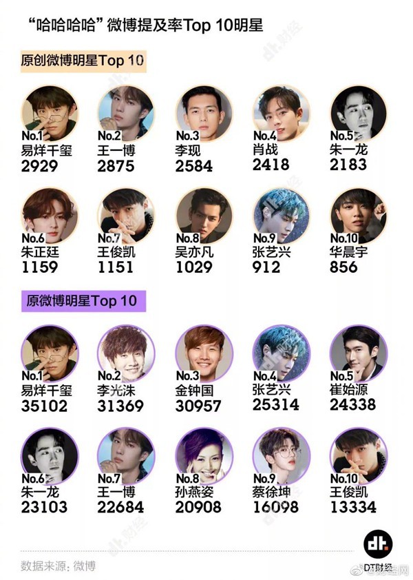 数据显示,星期二是微博最快乐的一天,甚至比周末还要快乐。一到午休,“哈哈哈”的微博数量就开始飙升,这个高峰也一直持续到了下午14点。同时,现代人至少有近1/3的微博快乐来自于追星。原创“哈哈哈哈”微博提及的明星Top 10是清一色的热门偶像,占据两榜第一的@TFBOYS-易烊千玺 成为了互联网上最大的快乐源泉。