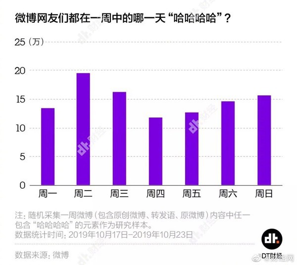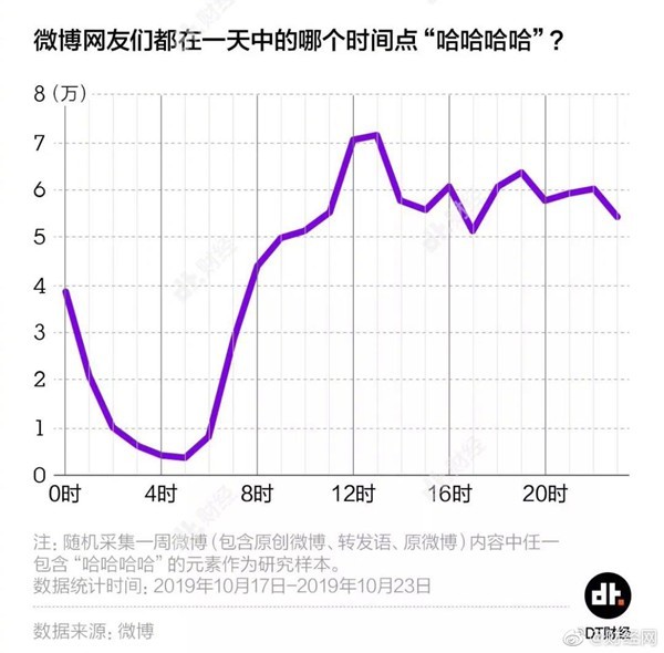 微博用户都在什么时候哈哈哈?他们都在“哈哈”些什么东西?到底有什么这么好笑?记者随机采集了微博上一周时间内(2019年10月17至2019年10月23日),总共超过100万条转发或原创内容中带有“哈哈哈哈”(连续4个哈)的微博,窥探一下人们的快乐源泉。