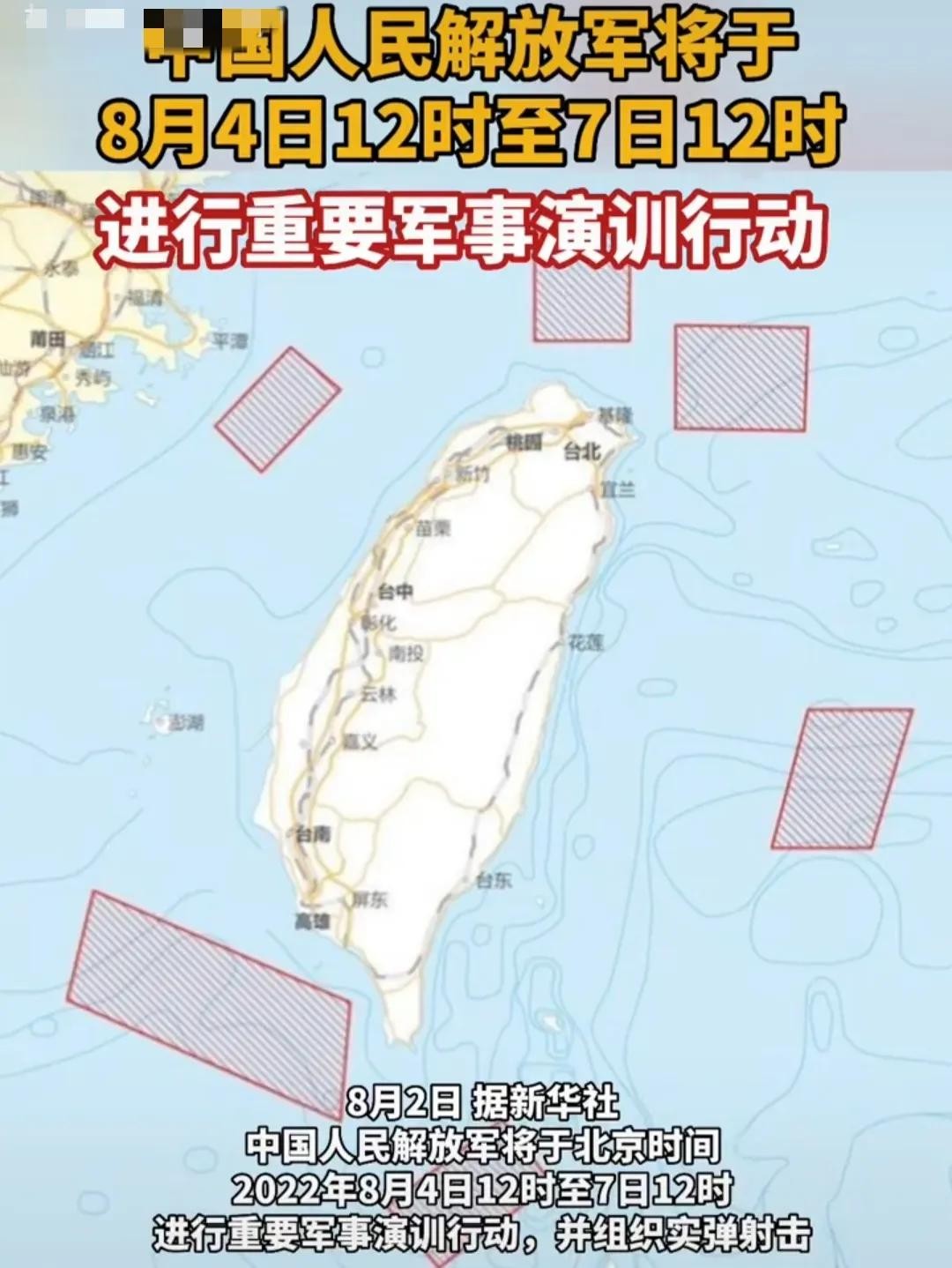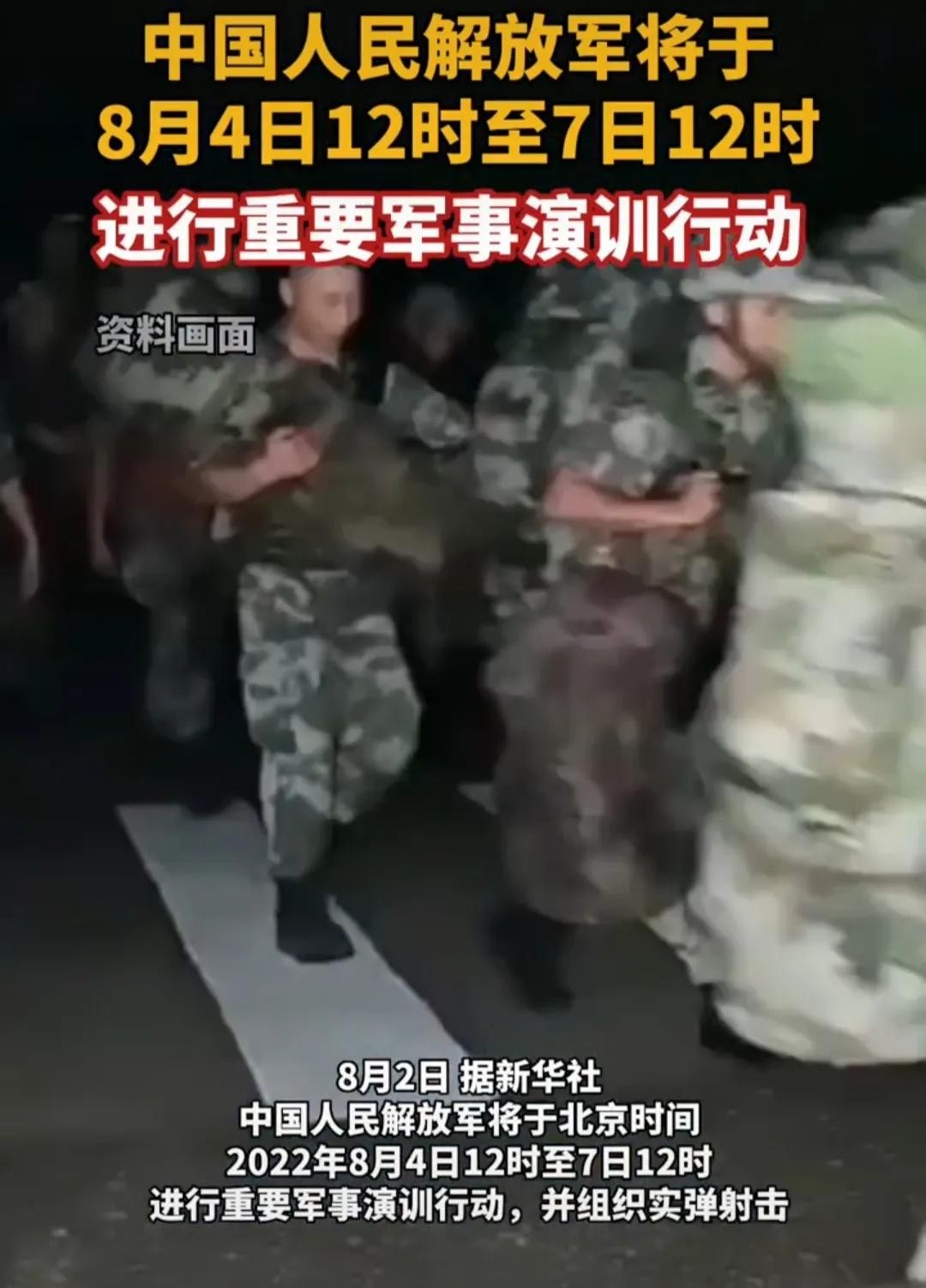 紧接着,中国人民解放军又宣布8月4日12时至7日12时在台湾省周边进行军事演训行动。