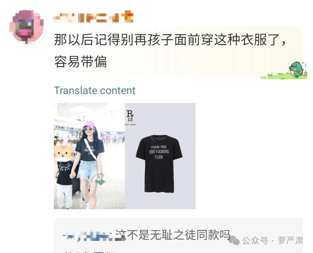 这本来不意外。意外的是我在评论里看到,男方粉丝迅速翻出一张图攻击陈妍希穿的T恤衫有英文脏话,容易把孩子带偏。