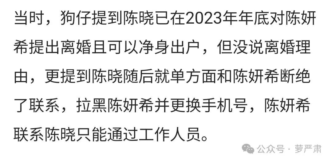 复习一下去年的爆料: 陈晓2023年年底跟陈妍希提出离婚,没有离婚理由,说自己可以净身出户;之后陈晓就再也没回过家,拉黑了陈妍希,手机号也换了,陈妍希想联系陈晓只能通过工作人员;江小宴跟拍了两口子,一直都没拍到在一起。